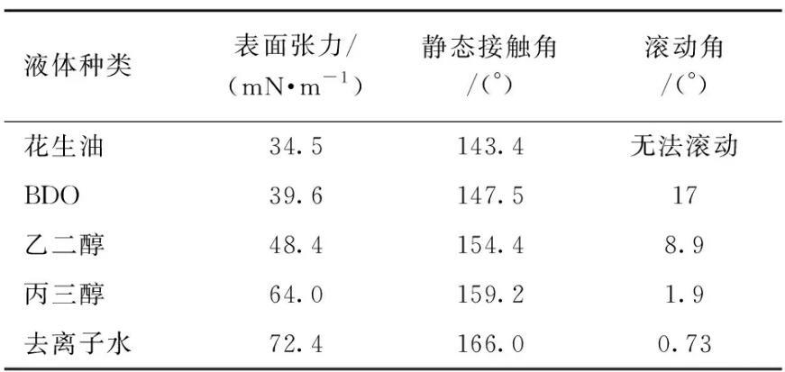 為了檢測涂層的表面性能,分別測試了5種液體在其表面的靜態(tài)接觸角和滾動角,結(jié)果見表2。
