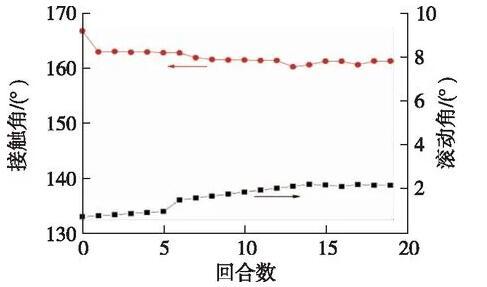 圖5為超疏涂層在經(jīng)過19次磨損的每次磨損周期后對水的接觸角和滾動角變化情況。