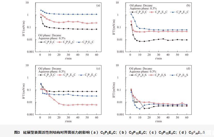 EO基團(tuán)為弱親水基團(tuán),界面上表面活性劑分子的EO鏈傾向于伸入水相。當(dāng)EO鏈過長時(shí),整個(gè)表面活性劑分子呈現(xiàn)兩頭大、中間細(xì)的“啞鈴”狀結(jié)構(gòu),影響界面吸附膜的緊密程度,造成界面張力升高。根據(jù)羧酸鹽型延展型表面活性劑的結(jié)構(gòu)-活性關(guān)系認(rèn)識,選擇可能具備超低界面張力活性的硫酸鹽型延展型表面活性劑(C8P10E5S、C8P15E5S、C8P15E10S)進(jìn)行界面張力測試,實(shí)驗(yàn)結(jié)果見圖3d。與羧酸鹽類似,上述硫酸鹽型延展型表面活性劑均能將正癸烷的界面張力降至超低。總之,充足的PO數(shù)和少量的EO數(shù)是延展型表面活性劑獲得超低界面張力的先決條件。
