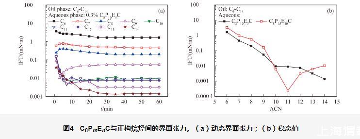圖5 C8PmEnS與正構(gòu)烷烴間的界面張力。(a)動態(tài)界面張力;(b)穩(wěn)態(tài)值