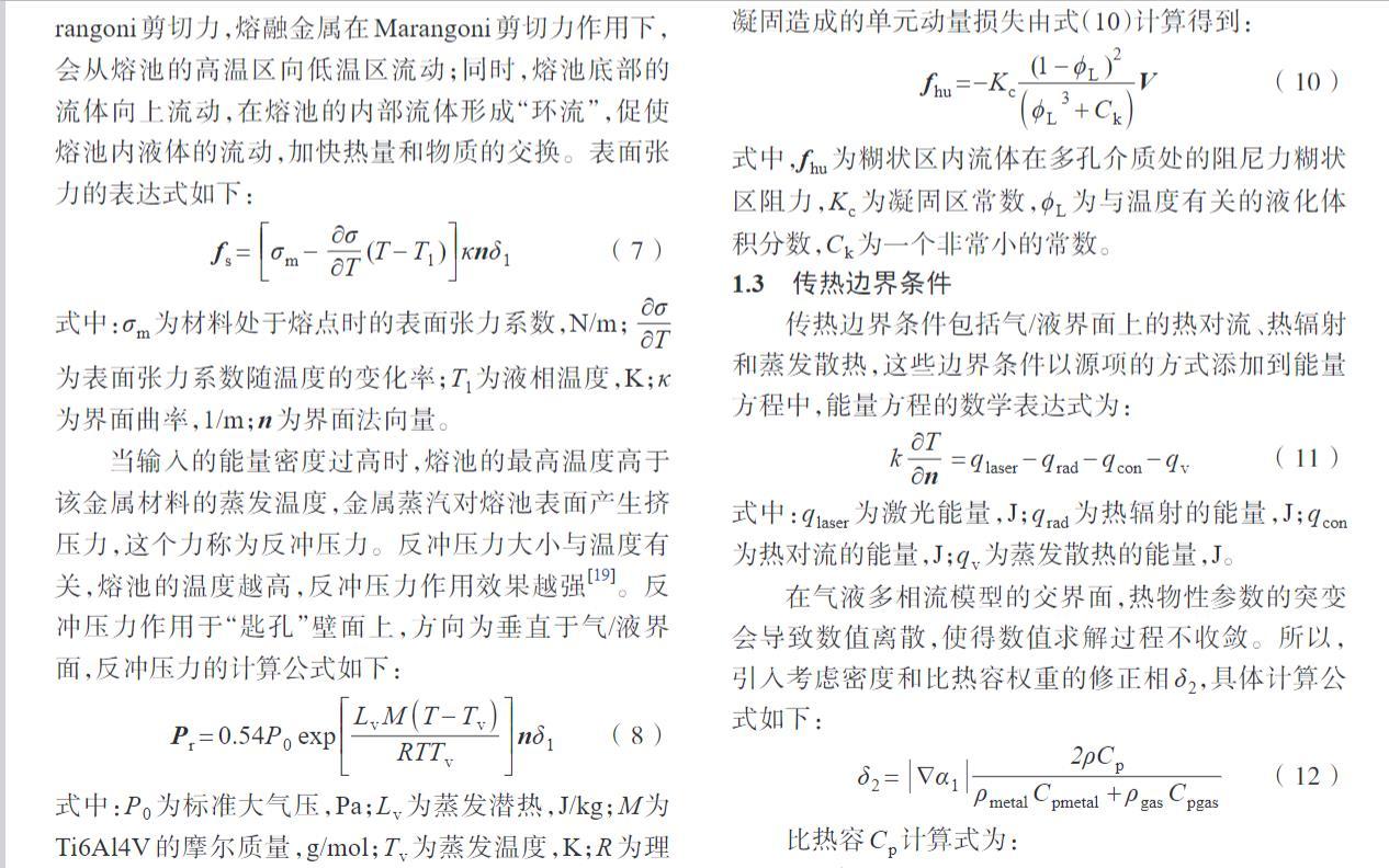 當輸入的能量密度過高時,熔池的最高溫度高于該金屬材料的蒸發(fā)溫度,金屬蒸汽對熔池表面產(chǎn)生擠壓力,這個力稱為反沖壓力。反沖壓力大小與溫度有關(guān),熔池的溫度越高,反沖壓力作用效果越強。反沖壓力作用于“匙孔”壁面上,方向為垂直于氣/液界面,反沖壓力的計算公式如下: