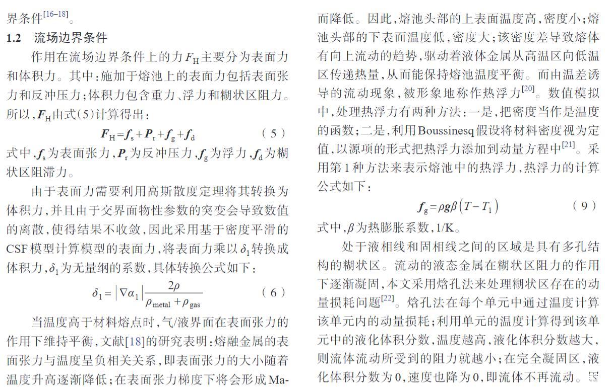 作用在流場邊界條件上的力FH主要分為表面力和體積力。其中:施加于熔池上的表面力包括表面張力和反沖壓力;體積力包含重力、浮力和糊狀區(qū)阻力。所以,F(xiàn)H由式(5)計算得出: