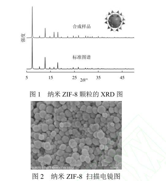 納米ZIF-8顆粒的XRD譜圖如圖1所示。合成的樣品譜圖分布與標準譜圖匹配,且所獲得的衍射峰與文獻吻合,未出現雜峰,表明制備的樣品具有單一相且結晶度良好。由謝樂公式計算得到晶粒尺寸約為70 nm。由納米ZIF-8顆粒的掃描電鏡照片可見,ZIF-8顆粒形貌為六邊形,平均尺寸為65.8 nm,與XRD計算結果一致。