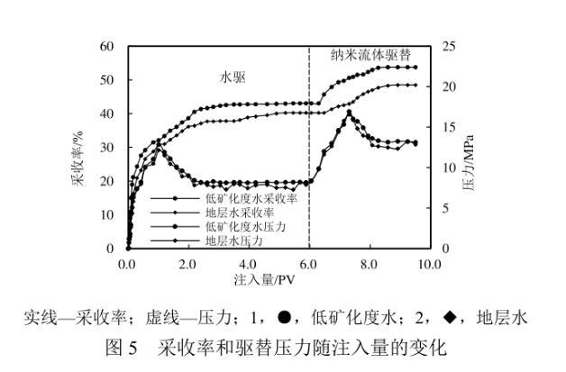 在驅油機理實驗探究的基礎上,優選納米ZIF-8顆粒質量分數為0.03%的納米流體進行巖心驅替實驗。采收率及驅替壓力隨注入體積的變化如圖5所示。使用模擬地層水、低礦化度水首次驅替至無油產出時的采收率分別為40.24%、43.06%。轉注含納米ZIF-8顆粒的流體后,受益于巖石表面潤濕性向著更加水濕轉變以及油水間界面張力的降低,油滴更易被剝落,且在流動過程中更易被注入液包裹形成乳狀液,增強了微觀驅替效率,從而使得最終采收率分別提高了8.25百分點和10.71百分點。注入納米流體后,驅替壓力得到了一定的提升。這可能是由于納米顆粒堵住了部分高滲通道,流體向孔滲條件較差的小孔隙流動,從而提高了波及效率,在一定程度上也有助于采收率的提高。