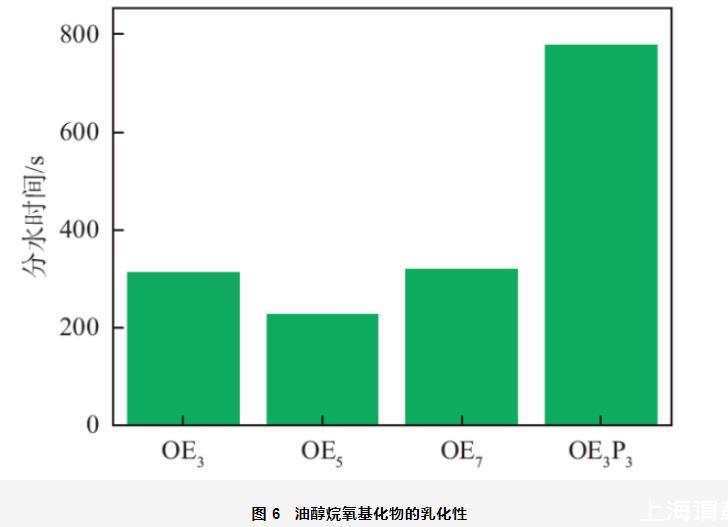 乳液是是熱力學不穩定體系,乳液穩定性可以通過測定發生乳化作用后分出一定體積水所需時間來表示,分水時間越長,乳化性能越好。油醇烷氧基化物的乳化性如圖6所示。OE3、OE5和OE7乳化液體石蠟的分水時間分別為313,228和319 s。當OEn中EO加合數由3增加到5時,其分水時間明顯降低,乳化性降低。這是因為EO基團為親水基團,當EO基團增加時,表面活性劑分子的親水性增加,與疏水性的液體石蠟相互作用減弱,乳化性降低。當EO加合數由5繼續增加到7時,其分水時間又顯著增大,乳化性增強。這是因為當EO基團的加合數較大時,EO基團具有一定的疏水性,表面活性劑分子與液體石蠟相互作用增強,乳化能力提高。從圖中還可以看出,當在OE3中引入PO基團后,OE3P3乳化液體石蠟的分水時間為778 s,乳化性顯著增強,這是因為PO基團是疏水性基團,且具有一定的支化結構,當分子中引入PO基團后,使其更容易“插入”油相,增強表面活性劑分子與油相液體石蠟之間的相互作用,乳化性顯著增強。