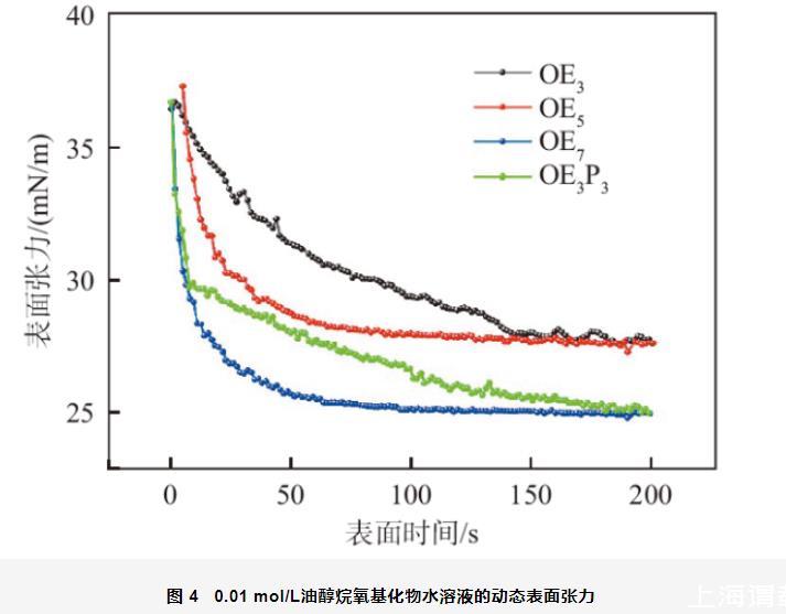 圖4為0.01 mol/L油醇烷氧基化物的動態表面張力。從圖4中可以看出,相同表面時間時油醇烷氧基化物動態表面張力的大小順序為:OE3>OE5>OE3P3>OE7,即其降低水的表面張力的能力順序為:OE3<OE5<OE3P3<OE7。隨著OEn分子結構中EO加合數的增加,其動態表面活性增強;在OE3分子中引入PO基團可以提高其動態表面活性。這與李本鋼等人報道的“親水基團相同時,表面活性劑分子親油性越強,動態表面活性越高”是一致的。從圖4還可以看出,當表面時間為3 s時,油醇烷氧基化物的動態表面張力為36~37 mN/m,該值顯著低于相同濃度、相同表面時間時C12EO6和C12EO8的動態表面活性(60 mN/m),這可能是由于油醇烷氧基化物具有較強的疏水性所致;另外,該值也顯著低于相同濃度、相同表面時間時陰離子表面活性劑OEnS(n=3,5,7)的動態表面張力(65 mN/m),這是因為非離子表面活性劑分子的吸附勢壘小于離子型表面活性劑。