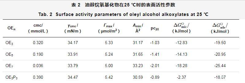 表2油醇烷氧基化物在25℃時的表面活性參數
