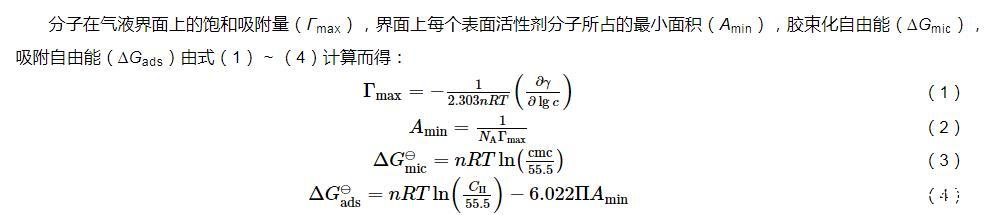 分子在氣液界面上的飽和吸附量(Γmax),界面上每個表面活性劑分子所占的最小面積(Amin),膠束化自由能(?Gmic),吸附自由能(?Gads)由式(1)~(4)計算而得: