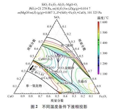 采用Factsage 6.4中“Equilib”模塊對不同堿度條件下的理論液相生成溫度以及不同溫度下的液相生成量進行計算,結果如表7所示。在不同堿度條件下,燒結礦的液相生成量隨溫度的變化如圖1所示。通過“Phase Diagram”模塊計算SiO?-CaO-Fe?O?體系:氧分壓固定為21278 Pa,Al?O?組元固定為1.47%,MgO組元固定為0.73%情況下的液相投影,溫度區間設置為1100~1600℃,升溫梯度為50℃,計算結果如圖2所示(圖中s、s2、s4、s6代表同種物質的不同晶體結構)。
