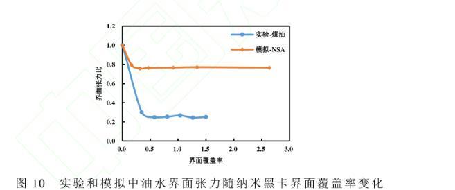 圖10實(shí)驗(yàn)和模擬中油水界面張力隨納米黑卡界面覆蓋率變化