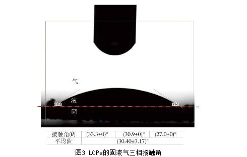 在食品工業(yè)中,濕潤性好的成分可能更容易溶解或分散,從而改善食品的質(zhì)地、口感或加工性能。LOPs(固相)、水(液相)和空氣(氣相)三相之間形成的接觸角θ可用于表示LOPs對水分的親和能力。當(dāng)θ小于90°時(shí),固體顆粒優(yōu)先被水濕潤,θ越小,其在水中的濕潤性及分散性越強(qiáng);θ大于90°時(shí),固體顆粒的親油性更強(qiáng);θ在90°左右,固體顆粒具有兩親性,有利于其在界面的吸附與排列。LOPs的固液氣三相接觸角圖片見圖3,LOPs壓片后與超純水和空氣3次接觸形成的接觸角均為銳角,經(jīng)OSA100型全自動界面黏彈性測量儀測得接觸角的平均值為(30.40±3.17)°。隨著時(shí)間的延長,最終水滴完全潤濕了LOPs壓片,實(shí)驗(yàn)表明LOPs具有較好的親水性。