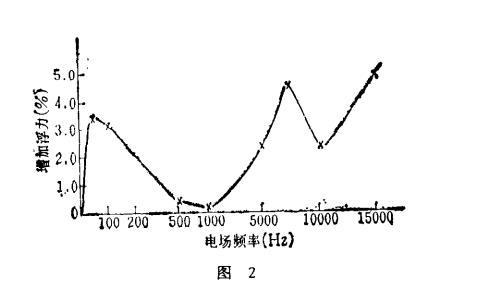 實驗上測得的浮力和水流過電場的速度關系曲線是有極值的,這一點和磁化水的情況相似[5]。這說明,在電場等固定的條件下,對應某一特定速度,電水效應最好,這給制造電水器提供了實驗依據。實驗上測得浮力和電場頻率之間的關系(見圖2),在某一頻率下曲線上出現極值。這可能是因為在該電場頻率下浮力變化大是從電場中吸收了能量,從而使水分子集團(H 2 O)n中的氫鍵破壞。當然,機理究竟是怎樣的,尚應進一步探討,但是本實驗是有意義的。
