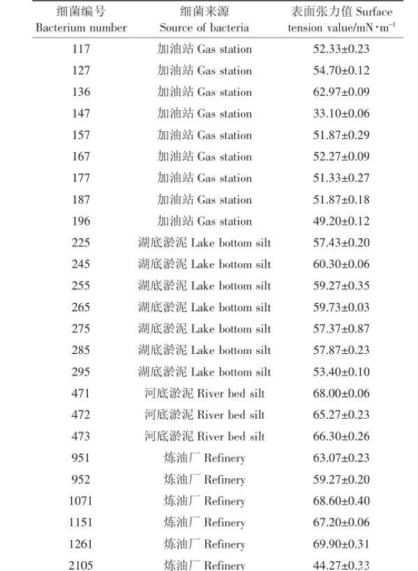 經過血平板初篩得到25株菌株,表1是表面張力儀復篩結果??梢园l現147號細菌發酵液的張力值明顯低于其他菌株,選擇147細菌作為目標菌株。