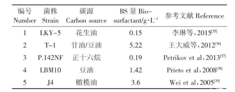 最佳培養條件下,本實驗細菌生物量最高能達到5.22 g·L-1(表6),生物表面活性劑量達到5.09 g·L-1。相對已報道的幾株銅綠假單胞菌(Pseudomonas aeruginosa)合成生物表面活性劑的產率在2.12~15.92 g·L-1范圍內,本菌株的產表面活性劑能力居中。