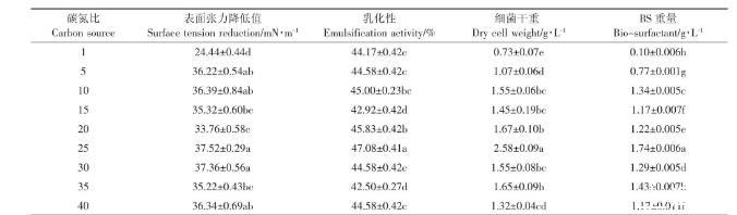表5碳氮比對147細菌生長以及生物表面活性劑產量的影響