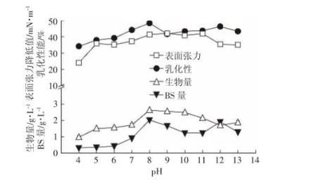 圖5 pH對147細菌生長以及生物表面活性劑產量的影響