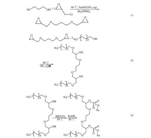 材料有:1-十二烷醇C12H25OH,化學純,濟寧宏明化學試劑有限公司生產;四丁基硫酸氫銨(TBAHS)Bu4NHSO4,分析純,天津致遠化學試劑有限公司;1,3-丙二醇HOCH2CH2CH2OH,分析純,濟寧宏明化學試劑有限公司生產;環氧氯丙烷C3H5ClO,化學純,濟寧宏明化學試劑有限公司生產;氫氧化鈉NaOH,分析純,濟寧宏明化學試劑有限公司生產;無水乙醇C?H?OH,化學純,濟寧宏明化學試劑有限公司生產;BF3-乙醚溶液,北京化工廠生產;氯磺酸HSO3Cl,化學純,成都化夏化學試劑有限公司生產;去離子水,分析純,實驗室自制。