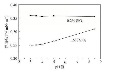 當(dāng)SiO2質(zhì)量分?jǐn)?shù)為1.5%時,納米SiO2/SDS體系靜置不久納米SiO2即聚集在一起,使得SiO2與SDS之間的排斥作用減小,隨著pH值的降低,水化作用力及H+保護(hù)層的形成使得納米SiO2聚集的幾率大大降低,SiO2顆粒在體系中分散較均勻,因此SiO2與SDS之間的排斥作用增大,體系降低油水界面張力的能力增強。當(dāng)SiO2質(zhì)量分?jǐn)?shù)為0.2%時,納米SiO2/SDS體系具有較好的穩(wěn)定性,pH值的下降對體系降低油水界面張力的能力基本無影響。