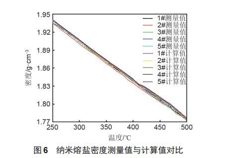根據混合物密度計算公式對納米熔鹽的密度進行計算后,與實驗測量得到的密度進行對比。
