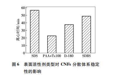 (1)UV-vis測(cè)試和Zeta電位測(cè)試結(jié)果表明,4種表面活性劑中,SDS對(duì)CNFs的分散性最好,SDBS次之,而D-180好于PAA復(fù)合Tx100.
