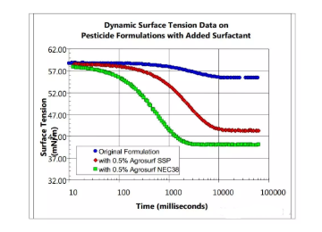 農(nóng)藥加工品種中,原藥是決定藥效的主要因素,而農(nóng)藥噴灑時能否在植被表面潤濕鋪展,很大程度上取決于農(nóng)藥的表面張力。將噴霧液滴尺寸降低到更小的尺寸(通常為100μm),可以將農(nóng)藥更加均勻的施加在農(nóng)作物上。由于噴涂是動態(tài)過程,不僅僅需要考慮添加表面活性劑后農(nóng)藥的平衡表面張力,更要考慮表面活性劑能夠多快的降低新形成界面的表面張力。