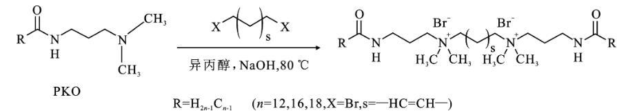 根據(jù)前期的工作[2-4]。在圓底燒瓶中,先將0.1 mol連接基化合物,反-1,4-二溴-2-丁烯溶于100 mL異丙醇中。將0.2 mol脂肪酸酰胺丙基二甲胺(PKO-12、PKO-16、PKO-18)加入反應(yīng)溶液中,并以氫氧化鈉0.4 g作為催化劑加速反應(yīng),在80℃下攪拌12 h。反應(yīng)結(jié)束后,用真空蒸發(fā)去除溶劑,得到蠟狀的粗產(chǎn)物。將得到的蠟狀粗品固體在乙酸乙酯/乙醇(20∶1)混合溶劑中重結(jié)晶3次,得到白色粉末狀陽離子Gemini表面活性劑。所制備的Gemini表面活性劑(GS-12,GS-16,GS-18)的產(chǎn)率分別為93.5%,92.4%,94.1%。Gemini表面活性劑GS-12,GS-16,GS-18的合成路線如下: