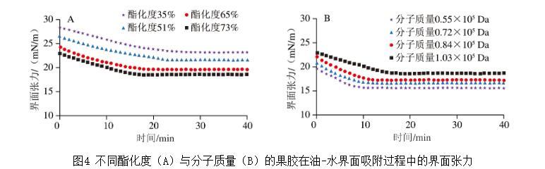 圖4不同酯化度(A)與分子質量(B)的果膠在油-水界面吸附過程中的界面張力
