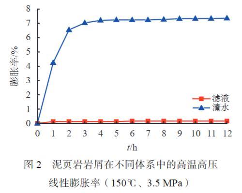 此外,目標區(qū)塊儲層段巖屑的線性膨脹率實驗結果如圖2所示。結果顯示,巖屑在清水中浸泡12 h的線性膨脹率為7.32%,在抗超高溫低滲透儲層鉆開液中浸泡的線性膨脹率為0.15%,表明該鉆開液體系抑制地層巖石水化膨脹性能效果好,有利于減少井壁巖石水化,穩(wěn)定井壁和保障井筒安全。