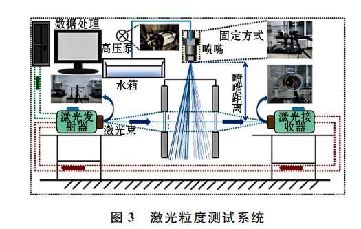 從圖3可知,噴霧粒徑測試主要儀器及工具包括激光粒度分析儀、高壓噴霧水泵、計算機分析控制系統等。計算機分析控制系統使用PAQXOS 4.1測量軟件,該軟件可定義、控制整個測量過程,并在試驗結束后處理測量的粒度分布數據。