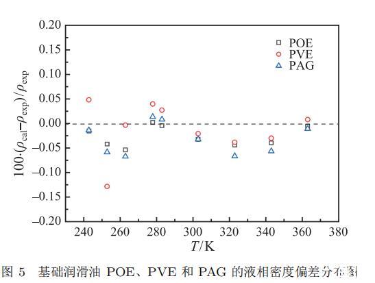 圖 5 基礎潤滑油 POE、PVE 和 PAG 的液相密度偏差分布圖