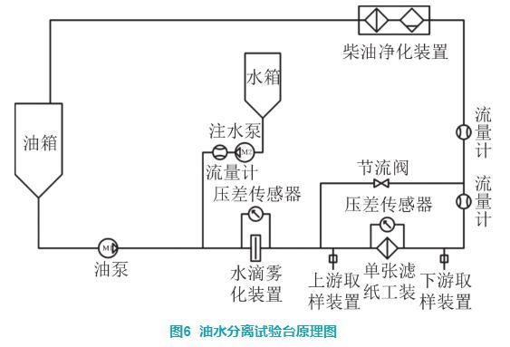 油水分離試驗臺的原理如圖6所示。通過向水滴霧化裝置上游管路內(nèi)按質(zhì)量比0.15%的比例注水,油水混合物通過孔板裝置后柴油中的水會破散成更小的水滴,通過控制水滴霧化裝置兩端的壓差可以得到不同粒徑分布的水滴,調(diào)節(jié)壓差得到合適粒徑分布的水滴進行油水分離效率試驗。