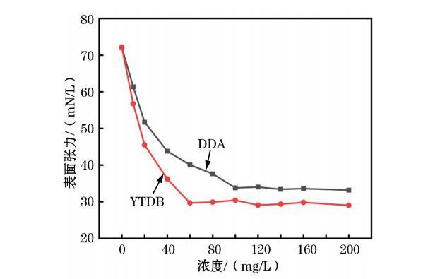 圖6顯示了DDA與YTDB在石英礦漿中的表面張力。由圖6可知,隨著捕收劑濃度增大,液體的表面張力均逐漸降低。在DDA捕收體系中,當(dāng)濃度增加到100 mg/L時,液體的表面張力開始趨于穩(wěn)定,再增加DDA濃度,表面張力變化不大。故DDA體系下,液體的最低表面張力約為33.79 mN/m,臨界膠束濃度為100 mg/L;在YTDB捕收體系中,當(dāng)濃度增加到60 mg/L時,液體的表面張力開始趨于穩(wěn)定,再增加YTDB濃度,表面張力變化不大。故YTDB體系下,液體的最低表面張力約為29.67 mN/m,臨界膠束濃度為60 mg/L.綜上所述,從表面張力來看,YTDB形成膠束和降低表面張力能力更強(qiáng),疏水性更好,捕收能力更強(qiáng)。