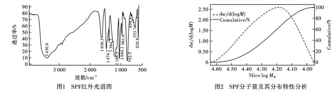 1)SPF紅外光譜分析(IR)SPF紅外光譜結(jié)果見圖1,3430.8cm?1為羥基伸縮振動峰,這不可能是醇羥基,而是酚羥基。3000cm附近有一個小峰,在1474.7cm是亞甲基變形振動峰,說明SPF中含有亞甲基。1636.5cm是苯環(huán)上的C=C鍵伸縮振動產(chǎn)生的特征吸收峰,在指紋區(qū)中的792.5cm?1區(qū)域中的譜帶是取代苯的1,2,6取代的特征吸收峰。1186.5cm?1和1044.1cm?1是由于S=O鍵伸縮振動產(chǎn)生的特征吸收峰,在700—500cm?1的連續(xù)吸收峰是S—O、S—S、C—S鍵伸縮振動產(chǎn)生吸收峰。SPF產(chǎn)物的分子中含有磺酸基、羥基和亞甲基等官能團(tuán)。