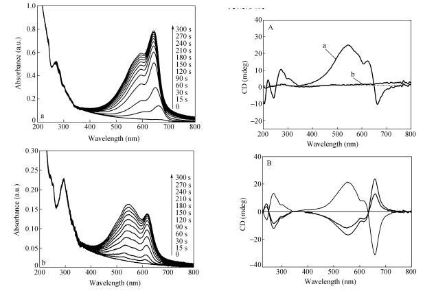 以CODA為例,隨著紫外光輻照時(shí)間增加,LB膜在590和640nm處出現(xiàn)2個(gè)典型的聚二乙炔藍(lán)相吸收峰,且隨時(shí)間增加而逐漸增強(qiáng),薄膜顏色由淡黃色變?yōu)樗{(lán)色。而對(duì)于CO2DA LB膜,隨著254nm紫外光輻照時(shí)間的增加,在540和620nm處出現(xiàn)兩個(gè)明顯的吸收峰,分別對(duì)應(yīng)于聚二乙炔紅相和藍(lán)相的典型吸收,薄膜顏色由淡黃色變?yōu)樽仙kS著輻照時(shí)間的增加,540nm處吸收峰明顯增強(qiáng),聚合薄膜中聚二乙炔紅相組分變多。
