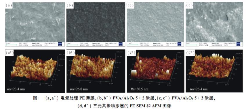 涂覆PVA/Al?O?后,表面變得更為粗糙,Al?O?納米顆粒均勻分散在PVA基質(zhì)中,形成了微納復(fù)合結(jié)構(gòu)。AFM測(cè)得的粗糙度(Ra)順序?yàn)椋篜VA/Al?O?5:3>5:2>AHB三元共聚物>電暈PE。