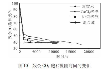 活塞式驅(qū)替階段:驅(qū)替液突破巖心前,驅(qū)替過對巖心中CO2的推擠,將巖心中大部分不受毛細力控制的CO2氣體排出,驅(qū)替出的CO2氣量大,殘余CO2飽和度隨時間迅速減小。攜帶驅(qū)替階段:驅(qū)替液突破巖心后,巖心中的大部O2氣體已被驅(qū)出,驅(qū)替液只能裹挾出受毛細制較弱的部分氣體和殘留的小部分自由氣體,所以從巖心中驅(qū)替出的CO2迅速減少,殘余CO2飽和度隨時間減小的速率也大大降低,隨著巖心CO2氣體不斷減少,殘余CO2飽和度最終趨于定。不同溶液驅(qū)替條件下殘余CO2飽和度趨于的速率由大到小依次為:10%CaCl2溶液、%NaCl溶液、蒸餾水。第二階段對最終的殘余CO2飽和度貢獻很小。本實驗所使用的是飽和了CO2的驅(qū)替液,所以不存在Li等實驗中的殘余飽和度曲線的溶解式驅(qū)替階段。