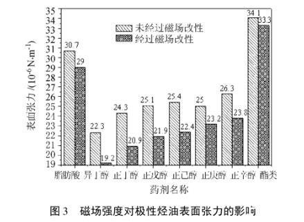 2)經(jīng)過(guò)磁場(chǎng)改性后,極性烴油的表面張力會(huì)降低。