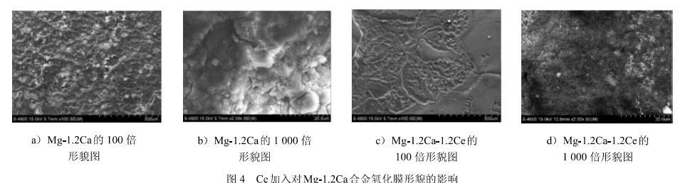 圖4 Ce加入對Mg-1.2Ca合金氧化膜形貌的影響