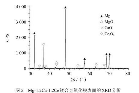從式(9)、(12)、(15)可知,從熱力學(xué)上講,在氧化開始時Mg、Ca和Ce 3種元素均有可能發(fā)生氧化;從式(16)、(17)、(18)可以看出,由于活度的影響,式(4)、(5)、(6)所述的置換反應(yīng)在元素分布均勻的情況下不可能發(fā)生;從式(8)、(11)、(14)各氧化物分解壓的計算,MgO、CaO和Ce_2 O_3分解壓的大小順序為:PMgO^0>PCaO^0>PCe,O^0.此外,對氧化膜進行X射線衍射結(jié)果表明(圖5),氧化膜中并未出現(xiàn)新的復(fù)雜氧化物,可見MgO、CaO和Ce_2 O_3是互不固溶的.按熱力學(xué)規(guī)律,此時合金將分層氧化,即氧化膜外層氧壓高生成的氧化物其分解壓也大,氧化膜內(nèi)層氧壓低生成的氧化物其分解壓也小。所以Mg-1.2 Ca-1.2 Ce來說,將按照這樣的順序來氧化:最外層是MgO,其次是CaO,最內(nèi)層是Ce_2 O_3.至此,初始的保護性氧化膜形成.