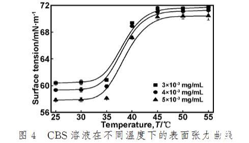 (3)CBS溶液的表面張力隨溫度的升高呈現兩種狀態(tài)。在低溫下,保持較好的表面活性,當溫度升高到一定程度(>35℃),由于變性作用,使得CBS的表面張力急劇增大。