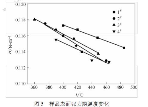 圖5樣品表面張力隨溫度變化