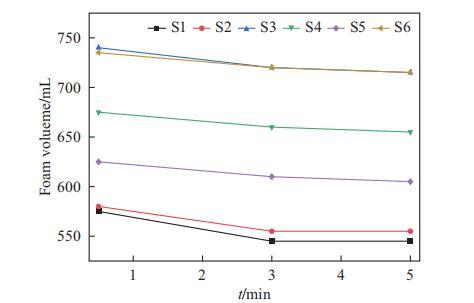 表面活性劑復合物的發(fā)泡性能評估如圖3所示。通常,SMCT體系顯示出比SLES體系更好的泡沫性能(S4 vs S1,S5 vs S2,S3≈S6)。以30秒時的泡沫體積為例。對于SLES體系(S1-S3),二元體系S1和三元體系S2(含DG)的泡沫體積相似,約為575 mL,而S3(含海藻糖脂)的泡沫體積約為740 mL。對于SMCT體系,二元體系S4的泡沫體積約為675 mL,加入DG(S5)后降至625 mL,但加入海藻糖脂(S6)后增加至約740 mL。這表明在二元SLES或SMCT體系中加入DG并未增強發(fā)泡性能。然而,在含有海藻糖脂作為輔助表面活性劑的復合物S3和S6中觀察到了協(xié)同效應。這種增強的發(fā)泡效果可能歸因于在SLES和SMCT體系中加入海藻糖脂后表面張力的降低。