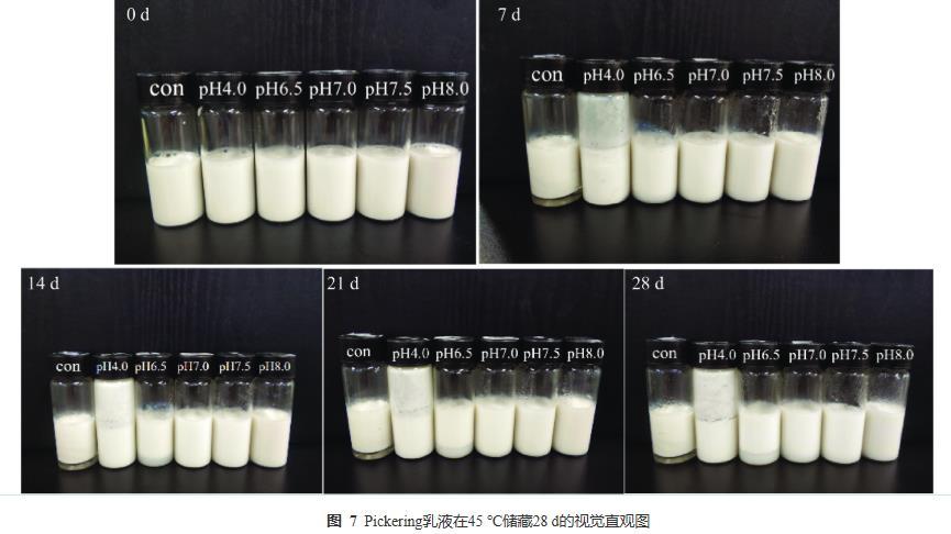 制備了不同pH下PPP-NP穩定的水包油Pickering乳液,并在45℃下加速儲存28 d,每7 d進行拍照記錄其視覺外觀的變化。乳液的視覺外觀監測照片如圖7所示。con和pH4.0的乳液在加速儲藏7 d后發生分層和聚結等現象;pH6.5的乳液在第14 d時底部出現分層現象;pH7.0~8.0的乳液在儲藏28 d后仍保持良好的視覺外觀,未出現相分離、聚結等現象,在整個實驗過程中均保持均勻穩定。這些現象直觀地表明PPP-NP具有良好的乳化能力,且制備出的乳液具有較好的穩定性,這可能與蛋白聚集體表面疏水性提高,從而有效降低其在油水界面上吸附所需的能量。