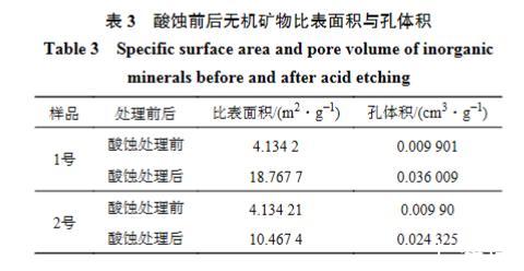 采用ASAP2460全自動比表面積與孔隙度分析儀測定采集無機礦物比表面積與孔隙體積。表3為多組分酸液酸蝕處理2種無機礦物前后測算結果。1號無機礦物酸蝕處理后比表面積增長4.539倍,孔體積增長約3.636 9倍;2號無機礦物酸蝕處理后比表面積增長2.418 8倍,孔體積增長2.457倍。因此酸蝕作用對無機礦物的溶蝕與解堵疏通作用顯著。
