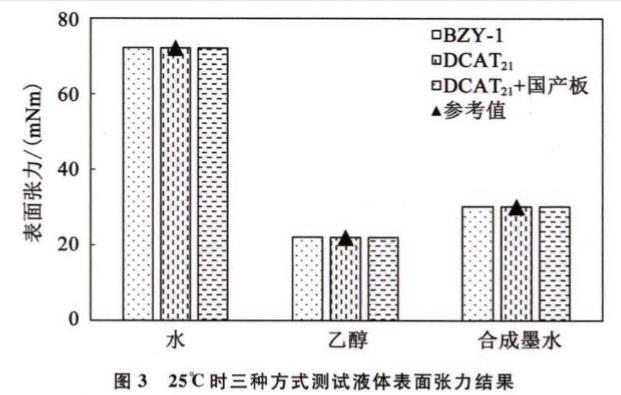 使用BZY-1表面張力儀(原配國(guó)產(chǎn)鉑金板)、表面張力儀(原配進(jìn)口鉑金板)和表面張力儀(選配國(guó)產(chǎn)鉑金板)對(duì)水、無(wú)水乙醇、合成墨水進(jìn)行表面張力測(cè)試,測(cè)試結(jié)果如圖3所示。