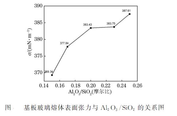圖 3 基板玻璃熔體表面張力與 Al?O?/SiO? 的關系圖