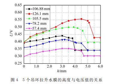 圖2是WBM-1A拉脫法液體表面張力實驗儀,用來測定純凈水的表面張力系數(shù)。實驗時采用標(biāo)準(zhǔn)吊環(huán)的內(nèi)、外徑分別為d1=33.10 mm,d2=34.96 mm,平均直徑為d?=34.03 mm,平均周長為πd?=106.88 mm。該標(biāo)準(zhǔn)環(huán)拉出的水膜高度與力敏傳感器電壓讀數(shù)之間的關(guān)系,如圖3所示??梢钥闯觯S著水膜高度的增加,吊環(huán)拉力逐漸增加到最大(圖中Umax表示),然后慢慢減小,直至水膜斷裂。圖中U斷前和U斷后分別表示水膜斷裂時和斷裂后的瞬時電壓值。吊環(huán)的受力變化情況與之前理論分析一致。