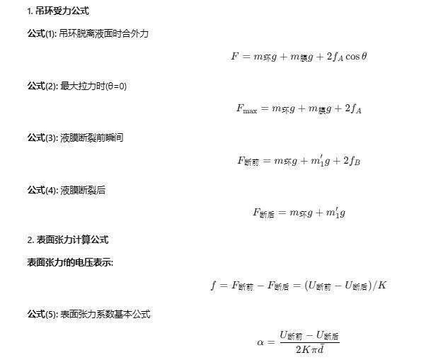 很顯然,對比式(3)和(4),液膜斷裂前、后的拉力之差為2fB,這正是液膜斷裂點的表面張力,計算出的表面張力系數(shù)是準(zhǔn)確的。同樣,對比式(2)和(4),吊環(huán)拉力之差為2fA + (m膜 - m1′)g,此差值中除了有表面張力外,還包含一部分液膜重力,所以計算出的表面張力系數(shù)數(shù)值將明顯偏大。因此文獻(xiàn)中普遍采用液膜斷裂點來計算表面張力系數(shù)。