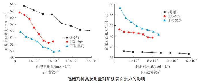 結果發現:隨著起泡劑用量的增加,黃鐵礦與磁黃鐵礦的表面張力均整體呈下降趨勢。對于黃鐵礦礦漿表面張力的影響,2號油>HX-609>丁銨黑藥,HX-609的表面張力雖然不是最低,但 HX-609達到最低礦漿表面張力所用藥劑用量最少,可以明顯降低藥劑使用成本。對于磁黃鐵礦礦漿表面張力的影響,丁銨黑藥>HX-609>2號油,且三者差值較大,2號油用量為3×10?? mol/L時可顯著降低礦漿表面張力。