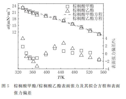 圖5 棕櫚酸甲酯、棕櫚酸乙酯的表面張力及其與方程(8)計算值的偏差